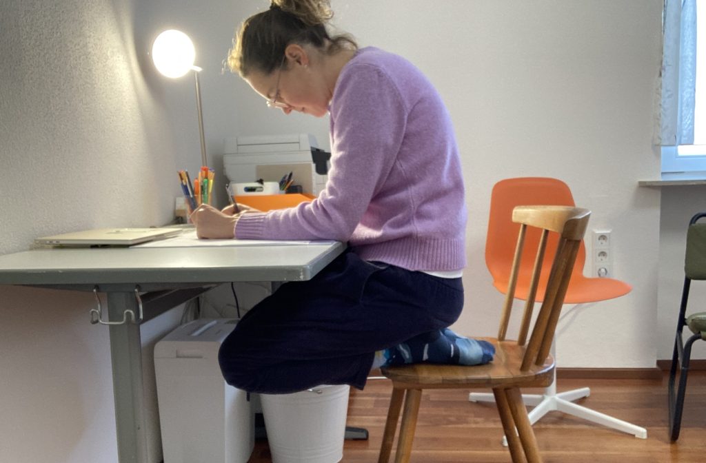 Wenn es Schularbeiten macht, nimmt es ganz komische Körperhaltungen ein.